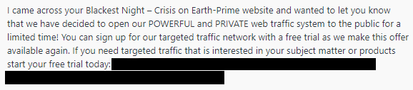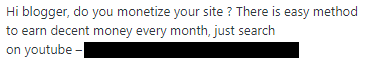 Full marks for your automated bot including the site and page name – that shows some effort on your part, so well done. Still not going to click on the link that I’ve blacked out, though.