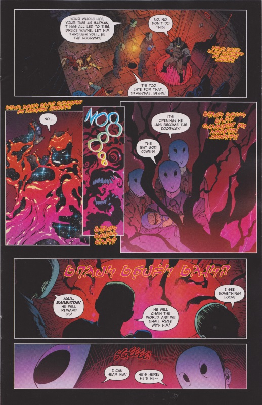 On page 20, the Court of Owls and the Strigydae trap Batman in order to raise the big bad guy, Barbatos, complete with a summoning ritual: