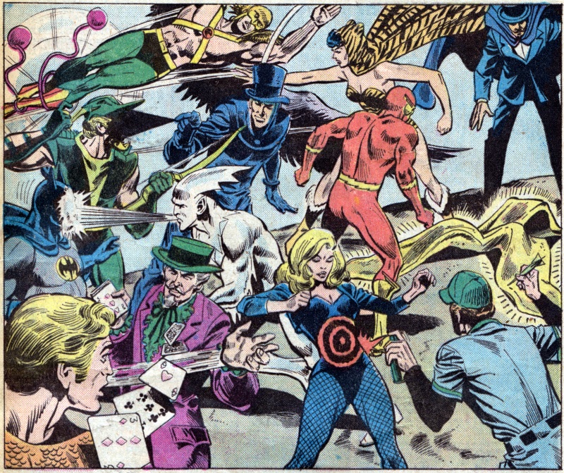Hawkman’s legs are being tied together by the Huntress; the Wizard’s thrown a huge banana in the path of the Flash; Green Arrow’s been blinded by the Shade; Batman’s been blinded by Icicle; Aquaman has (somehow) been distracted by the Gambler; and Black Canary is being attacked by Sportsmaster.