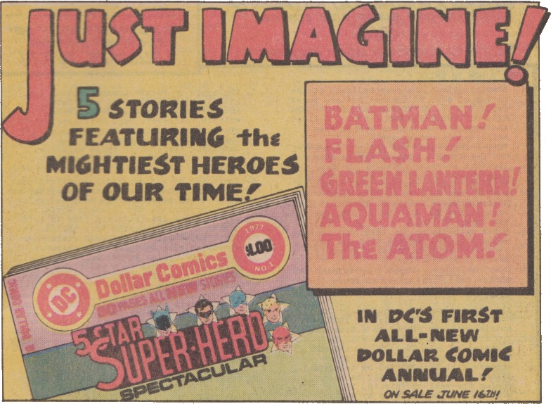 This is a genuine ad from 1977 where DC were touting stories “featuring the mightiest heroes of our time!”