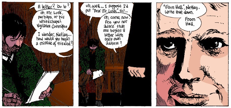 Well here’s news about something that I don’t know if I want or not: From Hell, the massive, wonderfully dark and rich retelling of the Jack The Ripper murders that worked so, so well in black and white . . . is being colourised by the artist, Eddie Campbell.