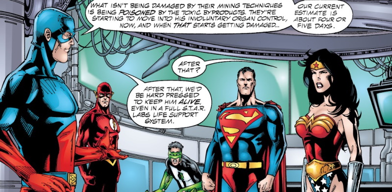 The scientist manages to break Superman out of his interrogation chamber and the pair of them free the rest of the JLA just as the scientist’s supporters attack the power plant, the fighting causing a massive explosion. In the outside world, this would be seen as the tumour’s chemistry changing and the automated laser surgical device would kick in, destroying the civilisation.