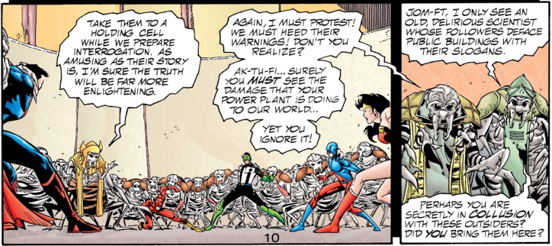 It’s hardly surprising, but the natives don’t readily believe the warnings from the JLA – with the exception of one scientist who’s been trying to convince the ruling council for years that this would happen – and they decide to imprison the heroes, a task made easier when the JLA find their powers no longer work.