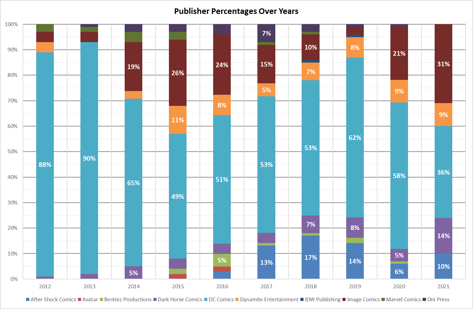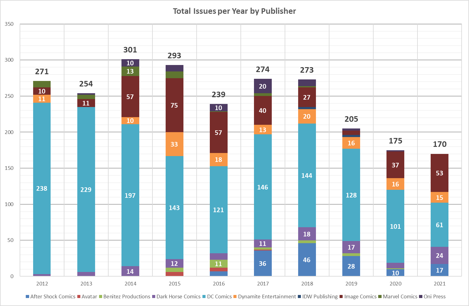 I’ve got records back to ’06 thanks to the Year in Review posts. Total number of new comics has been dropping (2006 – 199; 2021 -107), but most of that was done by 2008. Only dropping ~3 comics/year since then. Marvel peaks at the start and it’s mostly been dropping since then (total Marvel comics around the mid-50s in 2018, 2019, 2021). Still, it’s always #1, and almost always over 50% (except 2012 and 2018-2020). No other publisher has come closer than ~20 percentage points (DC in 2011/2012 and 2020.)