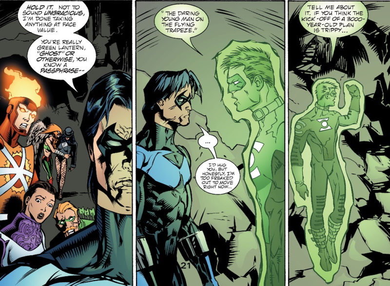 That explosion is a new form of bomb which provides enough energy for the ring-generated energy form holding the spirit of Green Lantern (stay with me, people) to grab the team and protect them. He introduces them to Manitou Raven and says they’ve been waiting for 3,000 years in order to work out a plan to go back in time and save everyone.