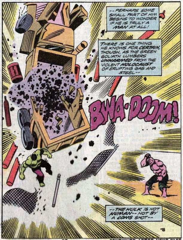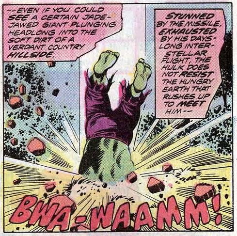 Hulk crashing to the ground after falling from a spaceship and being struck by a missile (all of which happened in the first three pages!)
