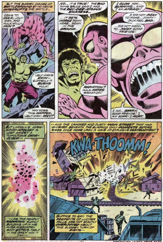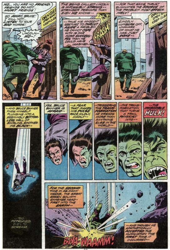 So much came flooding back! As to the story itself, despite his initial reservations, Banner comes to like Lincoln and enjoys a peaceful couple of weeks with the family until one of the young boys becomes ill, suffering from radiation sickness, caused (unknowingly) by proximity to Lincoln. Banner tries to do the right thing and tell Lincoln he should leave town to stop harming the people who have given him a home and the big guy reacts as you’d expect.