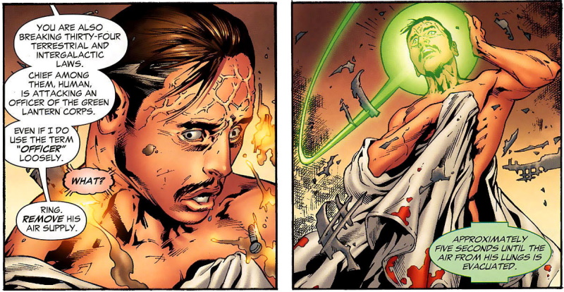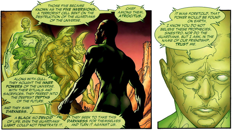 Abin Sur gets a retcon as well – it wasn’t a random yellow meteorite or his ship running out of fuel that caused him to crash on Earth; instead he was transporting Artrocitus as a prisoner, and his escape caused the crash. Unlike Sinestro, Atrocitus absolutely believes the prophecy mentioned by Abin Sur and has tracked down the one he thinks will give him what he needs.