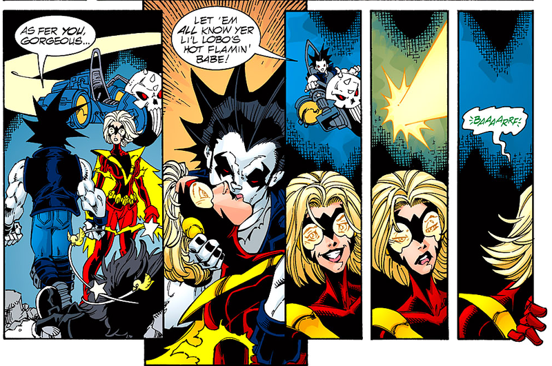Random Panel: Loverboy Lobo YOUNG JUSTICE #21 Only a couple of weeks ago Lobo was getting it on with Boodikka and now here he is smooching with Flamebird . . . who is not impressed. Share this: Click to share on Bluesky (Opens in new window) Bluesky Click to share on Reddit (Opens in new window) Reddit Share on Tumblr Click to email a link to a friend (Opens in new window) Email Click to share on Threads (Opens in new window) Threads Click to share on WhatsApp (Opens in new window) WhatsApp Click to share on Mastodon (Opens in new window) Mastodon Like Loading... Related