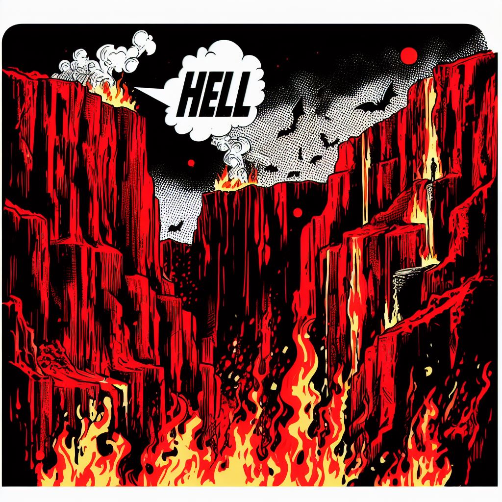 cliffs in hell, red and black, flames, comic book style