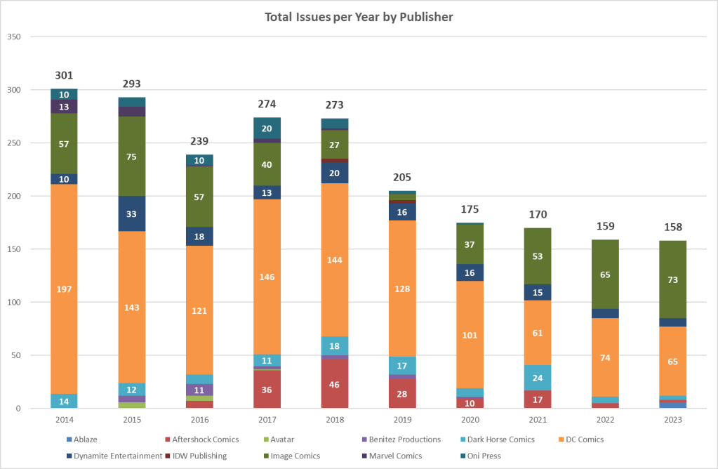 As you can see, my annual total of new comics is roughly half of what it was ten years ago and the only publisher that’s consistently growing since 2019 is Image – everything else is dropping off.