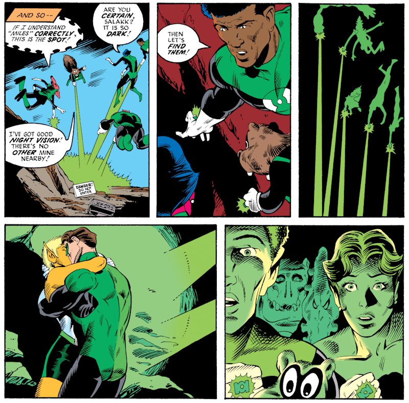As the team has just defeated Black Hand during his phase of spouting cliches and homilies, I thought the title of this post worked on a couple of levels as the GLC find Hal and Arisia getting it on!