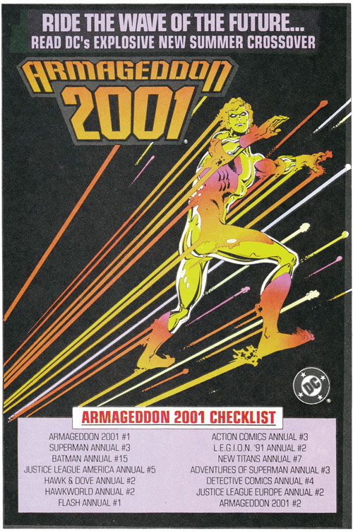 The end of Captain Atom’s late 80s/early 90s series was, of course, directly affected by the events of ARMAGEDDON 2001 mainly because, as we all know by now, Monarch was meant to be revealed as Cap himself. The final issue was also a tie-in to the WAR OF THE GODS series and sees Cap defeat the evil Shadowstorm before flying off, the last page directing readers to “Follow Captain Atom’s Destiny! Buy… ARMAGEDDON 2001 #2 On Sale Now!”