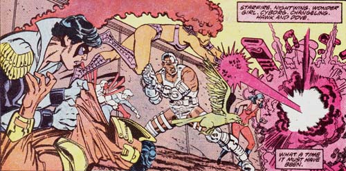 Page 18 – Panel 2: The Teen Titans. Left to right are Nightwing; an unknown villain; Hawk; Dove; Cyborg; Starfire; Changeling; and Wonder Girl.