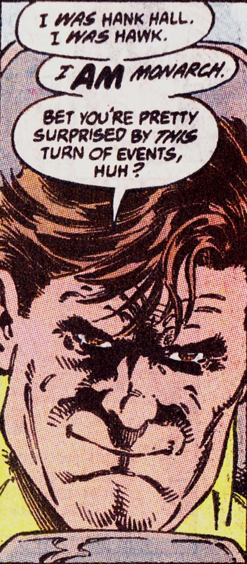 Page 41 – Panel 4: And here’s the big reveal – Monarch is Hawk!