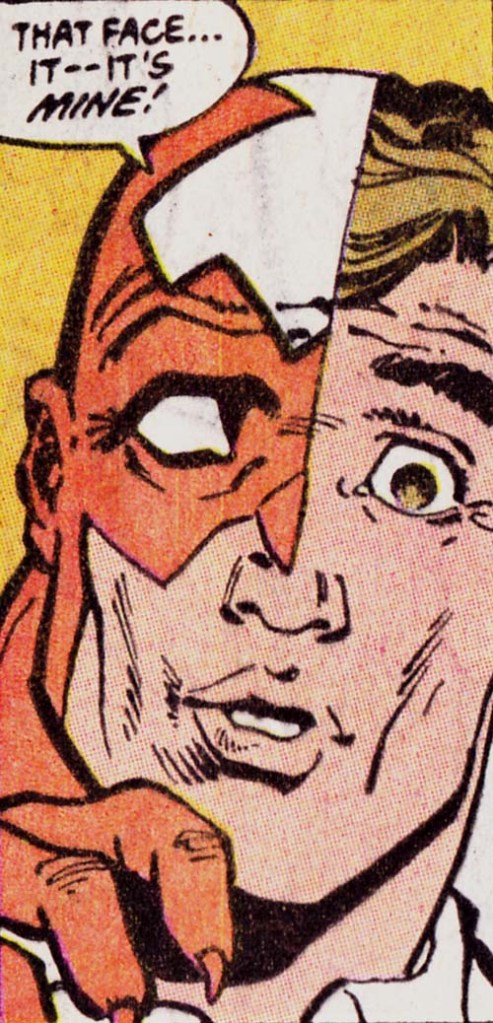 Page 40 – Panel 5: Hawk tears Monarch’s face plate off . . .