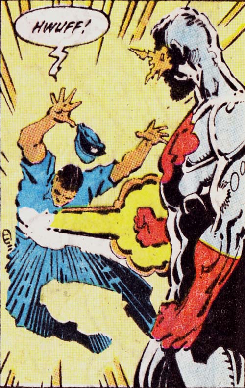 Page 13 – Panel 6: Captain Atom strikes down the police man when he doesn’t give him the information he needs. This is a serious step for a hero.
