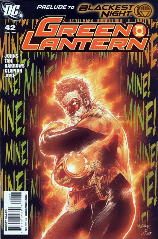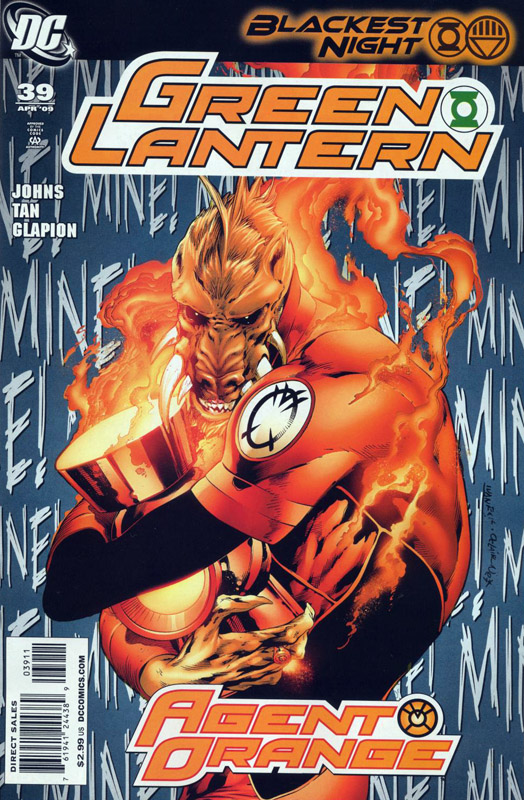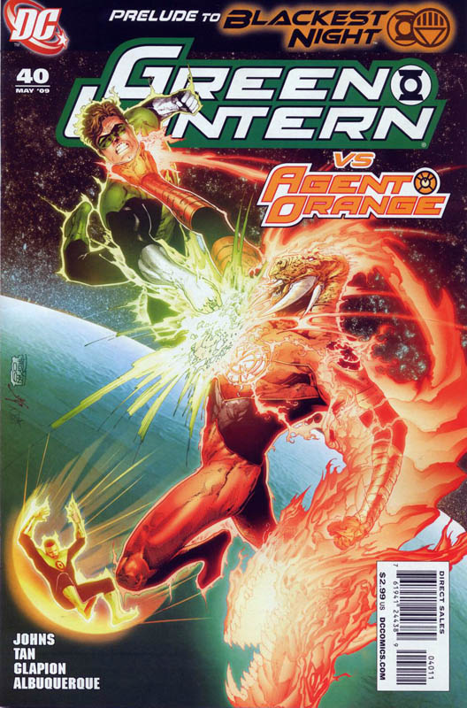 In the midst of the battle, Jordan is grabbed by the Orange light and pulled down through the earth to face Larfleeze who sees the Blue Ring he wears and demands to have one.
