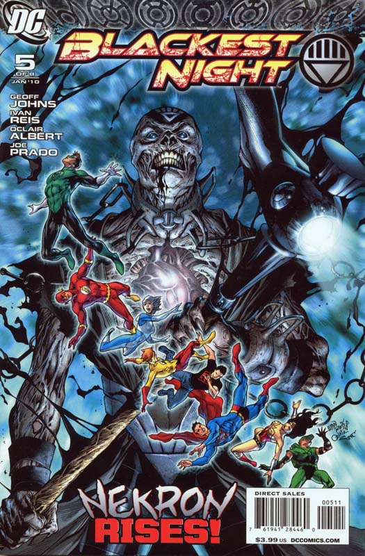 Standard Cover (above): The main figure is Nekron, the power behind the Black Lantern Corps. Moving diagonally from top left to bottom right are Green Lantern (GL) Hal Jordan; the Flash; Ice; Kid Flash; Superboy; Superman; Wonder Woman; and Green Arrow. All these characters have one thing in common: they all died and came back to life.