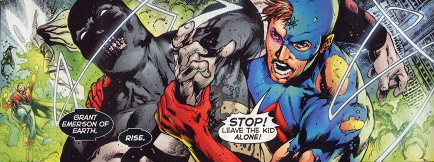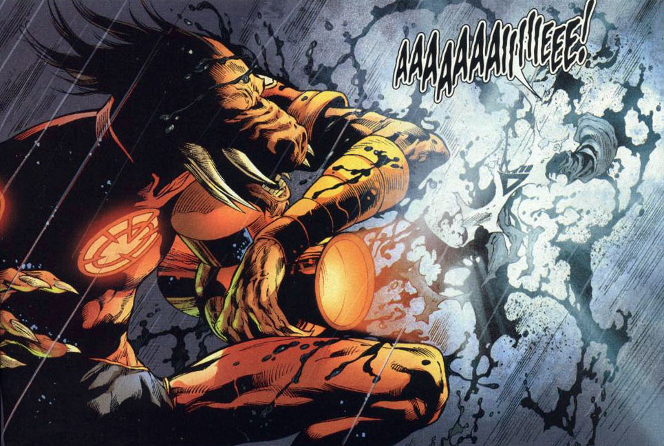 Page 13 – Panel 1: Scar, the Black Lantern Guardian, attacks in his stead.
