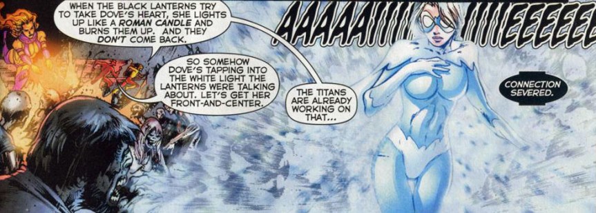 Page 11 – Panel 4: On the far left is Starfire; on the right is Dove. As Kid Flash says, Dove seems able to disconnect the dead from the Black Power Rings as shown in BLACKEST NIGHT: TITANS. The “white light” reference harks back to issue #3 when Indigo-1 gave a brief run-down of the origin of the emotional spectrum.