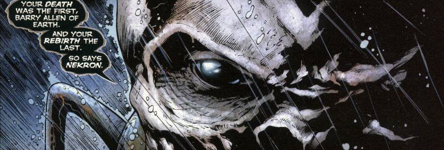 Page 5 – Panel 3: Flash died in CRISIS ON INFINITE EARTHS, helping to save the universe along the way. Other heroes had died before him (hell, the original Supergirl died in the issue directly before the one containing Flash’s death) so Nekron’s assertion that his death “was the first” is obviously not meant to be taken literally. Perhaps he refers to it having been an early example of a prominent character’s death and which, for many years, was seen as irreversible and lasting. Nekron’s next line about Flash’s “rebirth” is a nod to the series FLASH: REBIRTH, also written by Geoff Johns which details Flash’s return to the land of the living.