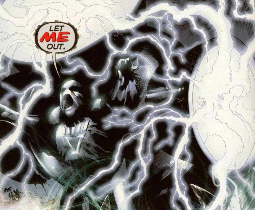Page 14 – Panel 4: Struggling and demanding to be released is the Anti-Monitor whose corpse resides within the battery. He appears to be draining the white light from Dove.