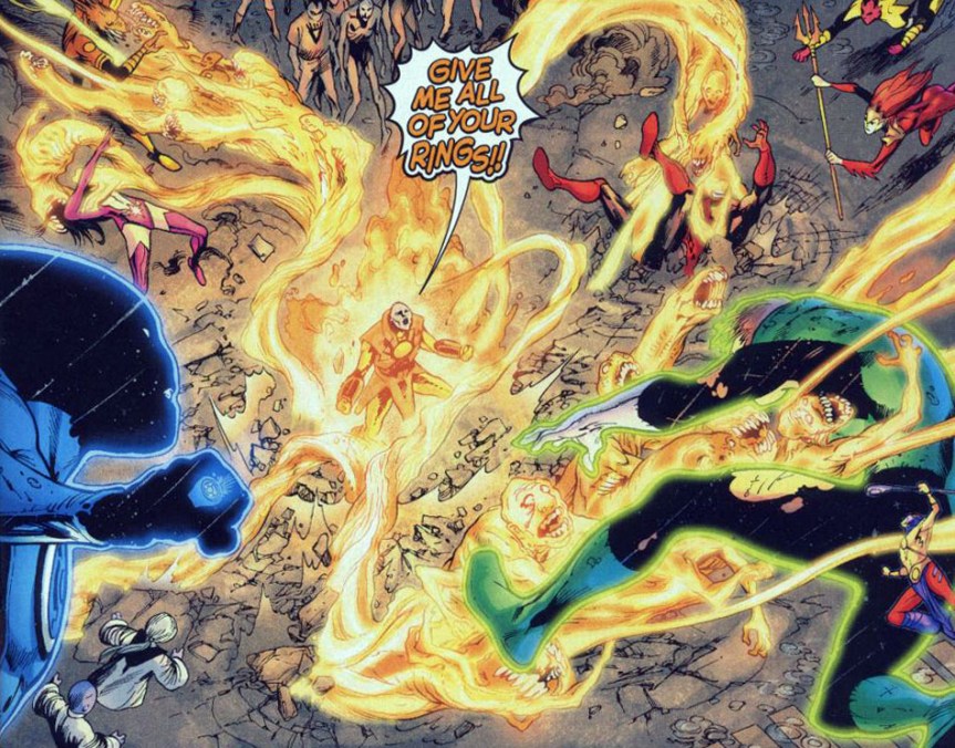 Page 21 – Panel 4: Driven by rage and grief, Sinestro attacks Ganthet.