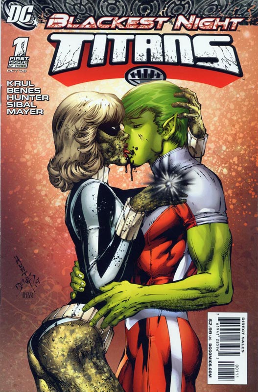 Outside, Beast Boy manages to free Cyborg and Starfire from their paralysis by knocking aside Omen and Terra. A moment later, however, and more Black Lanterns arrive. As the others battle the new arrivals, Terra tries to persuade Beast Boy that he still loves her. Donna and the others arrive and join the fight, Donna taking on first her dead husband and then, despite the pain it causes her, she kills her son. Beast Boy attacks Terra, literally ripping her in half, all the while aware that despite everything he still loves her.