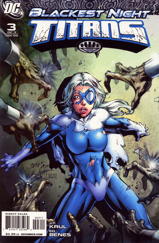 Trapped in the ruins of the Tower, Donna suffers a seizure, her eyes showing the Black Lantern symbol while outside, Beast Boy faces the other Black Lanterns alone just as more arrive in the shape of Tempest, Pantha, Wildebeest, Aquagirl and Dolphin.