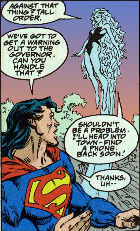 Page 38: Superman follows that tentacle he spotted on Page 34 and discovers the Taker is feeding from an oil deposit. A blast of heat vision causes the oil to explode, denying the Taker its energy.