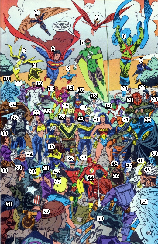 Page 53: This late in the game we get our first really big crowd scene. Click the picture on the right to see the full version, and the key is as follows: 1) Hawkman 2) Redwing 3) Dr Light 4) The Ray 5) Superman 6) The Atom (since when can he fly?) 7) Green Lantern 8) Martian Manhunter 9) Guy Gardner 10) Killowat 11) Arsenal 12) Bloodwynd 13) Red Star 14) Maxima 15) Booster Gold 16) Superboy 17) Terra 18) Power Girl 19) Changeling 20) Elongated Man 21) Battalion 22) Dagon 23) Etrigan 24) Tasmanian Devil 25) Lobo who is inappropriately touching 26) Layla 27) Vril Dox 28) Pax 29) Nightwing 30) Wonder Woman 31) Deathstroke 32) Batman 33) Myriad 34) Hitman 35) Pantha 36) Robin 37) Flash 38) Krag 39) Mongrel 40) Joe Public 41) Shadowstryke 42) Lionheart 43) Anima 44) Chimera 45) Gunfire 46) Razorsharp 47) Hook 48) Prism 49) Edge 50) Loose Cannon 51) Slignshot 52) Jamm 53) Argus 54) Sparx