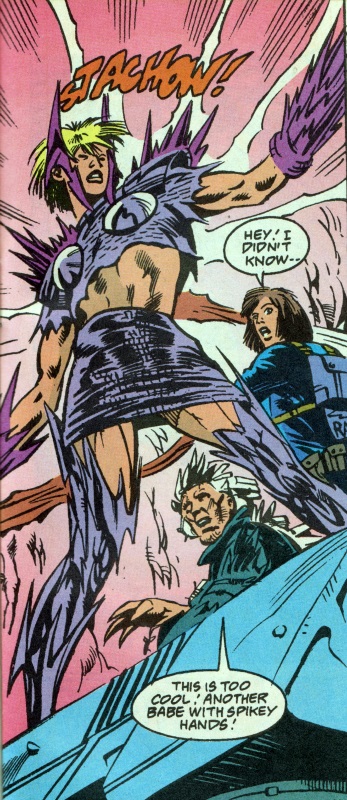 Page 26 – Panel 2: Back at the battle with the Taker, Sparx introduces herself to Mongrel who, as always, is a dick.