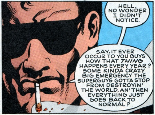 Never one to shy away from commenting on the ridiculous nature of superheroes, Ennis used Monaghan more than once to comment on capes in general and BLOODLINES specifically. Here’s a scene from the pages of HITMAN: