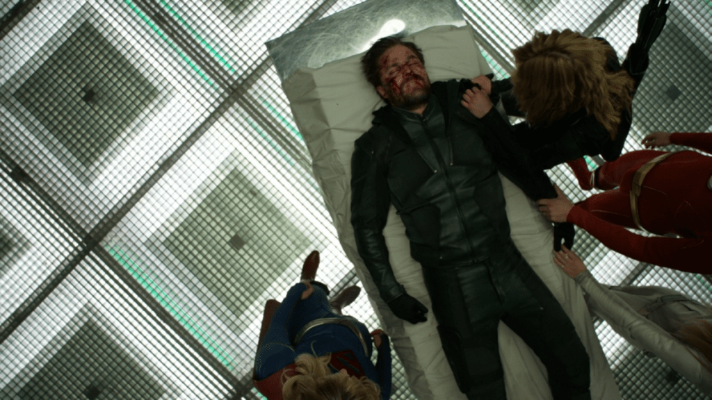 On Earth-1, the heroes arrive in Star Labs and find Green Arrow dying, the Monitor having pulled him from Earth-38 moments before its destruction. They are joined by Nash Wells, now Pariah, and White Canary and the others. With his dying breath, Green Arrow, passes the torch to Flash and Supergirl, and the Monitor admits he did not foresee this ending.