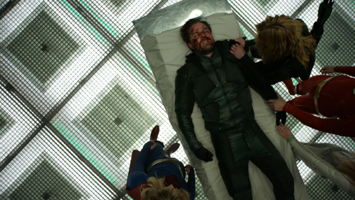 On Earth-1, the heroes arrive in Star Labs and find Green Arrow dying, the Monitor having pulled him from Earth-38 moments before its destruction. They are joined by Nash Wells, now Pariah, and White Canary and the others. With his dying breath, Green Arrow, passes the torch to Flash and Supergirl, and the Monitor admits he did not foresee this ending.