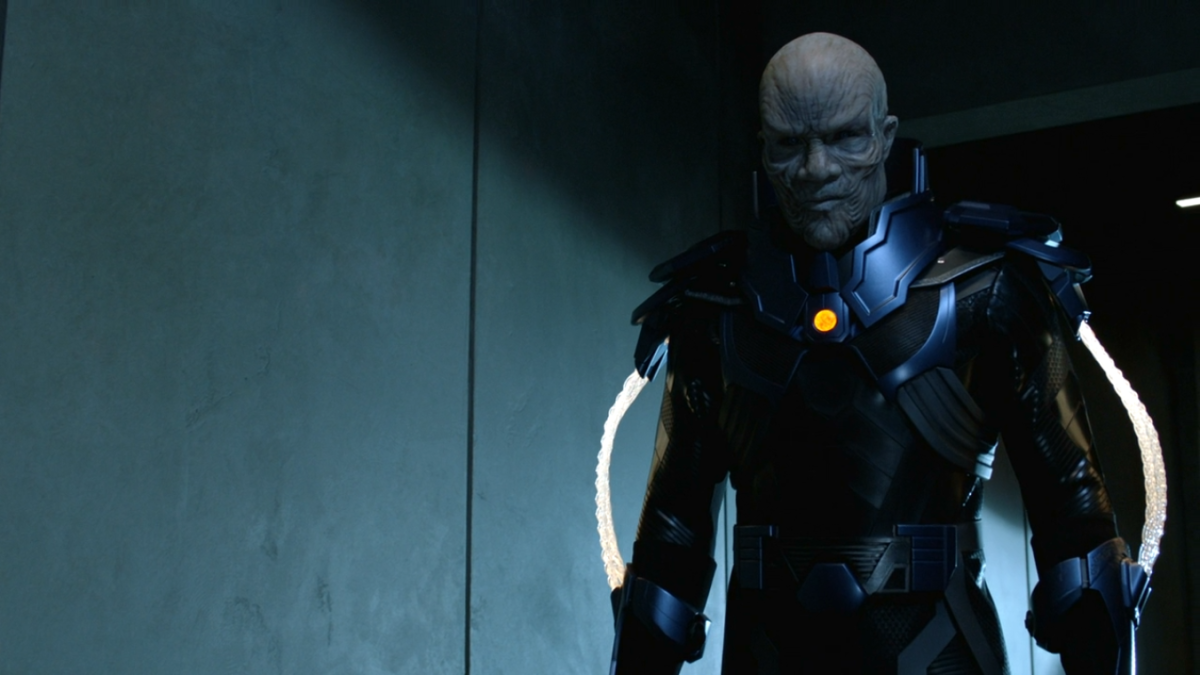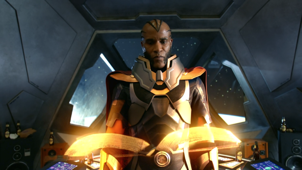 Harbinger vanishes from the Waverider and appears in STAR Labs and is confronted by the Anti-Monitor.