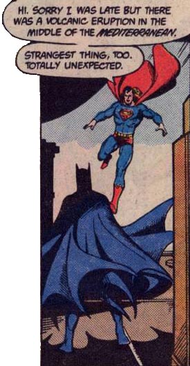 Page 14 – Panel 4: . . . Batman. Superman’s mention of a “totally unexpected” volcanic eruption harks back to the Monitor’s warning on Pages 9 and 10 about nature going through upheaval as a precursor to the anti-matter wave arriving.