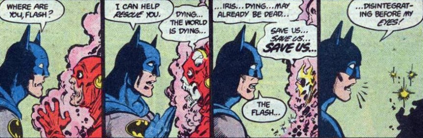 Page 8 – Panels 6 to 9: As Batman says, the Flash disintegrates before his eyes.