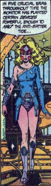 Page 12 – Panel 1: Stepping forward, Harbinger mentions the Monitor’s devices that are spread throughout time – these are the “vibrational tuning forks” that we’ll see soon. She states there are five of them but there are actually six, situated in: