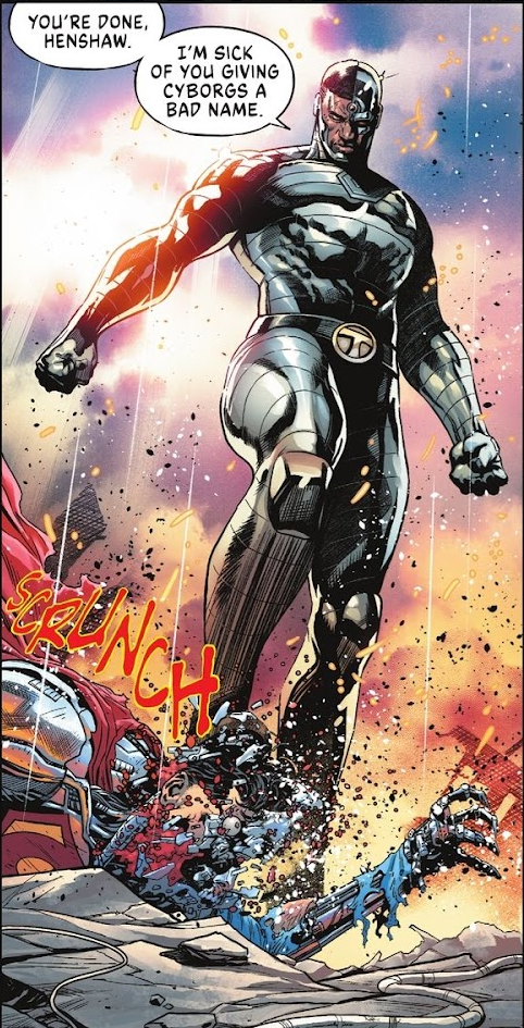 Page 20 – Panels 1 and 2: As Cyborg Superman struggles to continue the fight, Cyborg of the Titans comes along and finishes it.