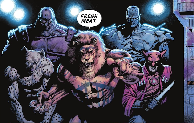 Page 5 – Panel 1: . . . Lionmane. Behind him, left to right are Hyena, Girder, Shrapnel, and Hellhound.