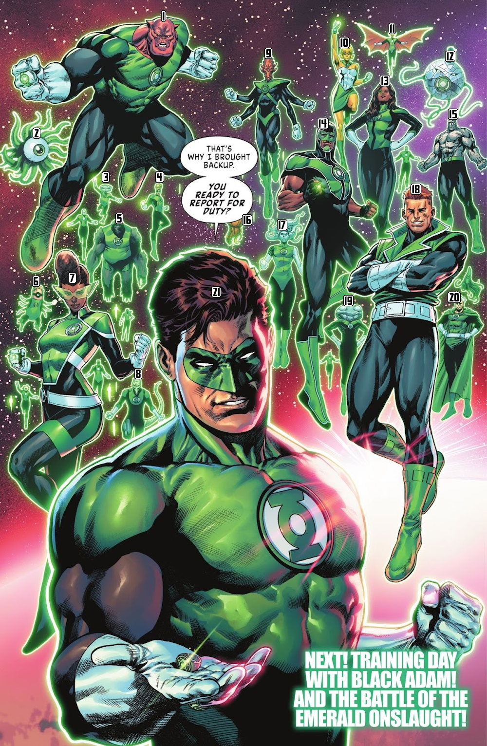 1) Kilowog 2) Penelops 3) Lok Neboora 4) Medphyll 5) Space Ape 6) Larvox 7) Jo Mullein 8) Isamot Kol 9) Salaak 10) Arisia 11) unknown 12) Chaselon 13) Jessica Cruz 14) Simon Baz 15) Hannu 16) Apros (mostly hidden by Hal’s speech balloon) 17) Two-Six 18) Guy Gardner 19) Rot Lop Fan 20) unknown 21) Hal Jordan