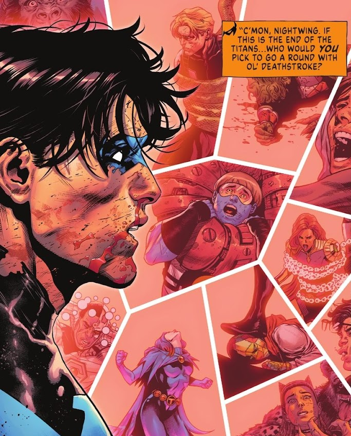 Page 8 – Panel 6: Ever the detective, Nightwing realises simply killing the heroes is not Deathstroke’s goal.