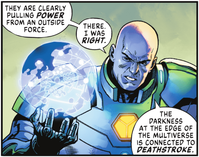 Page 21 – Panel 3: Luthor’s map of the multiverse now shows the darkness and it’s connection with Deathstroke.