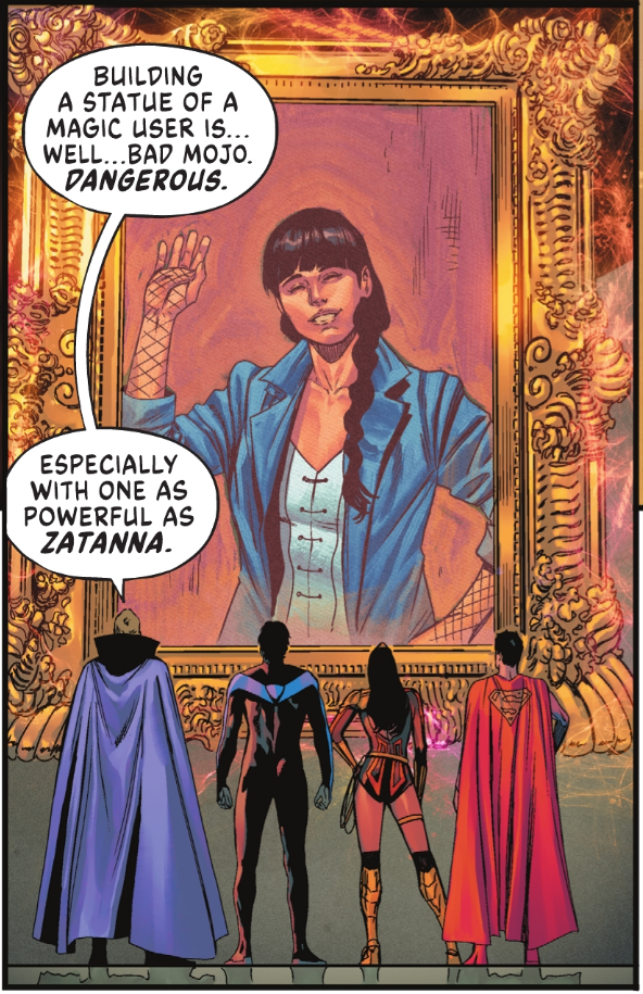 Page 18 – Panel 1: In the centre of the hall is a portrait to Zatanna who was lost with the rest of the team in JUSTICE LEAGUE #75.