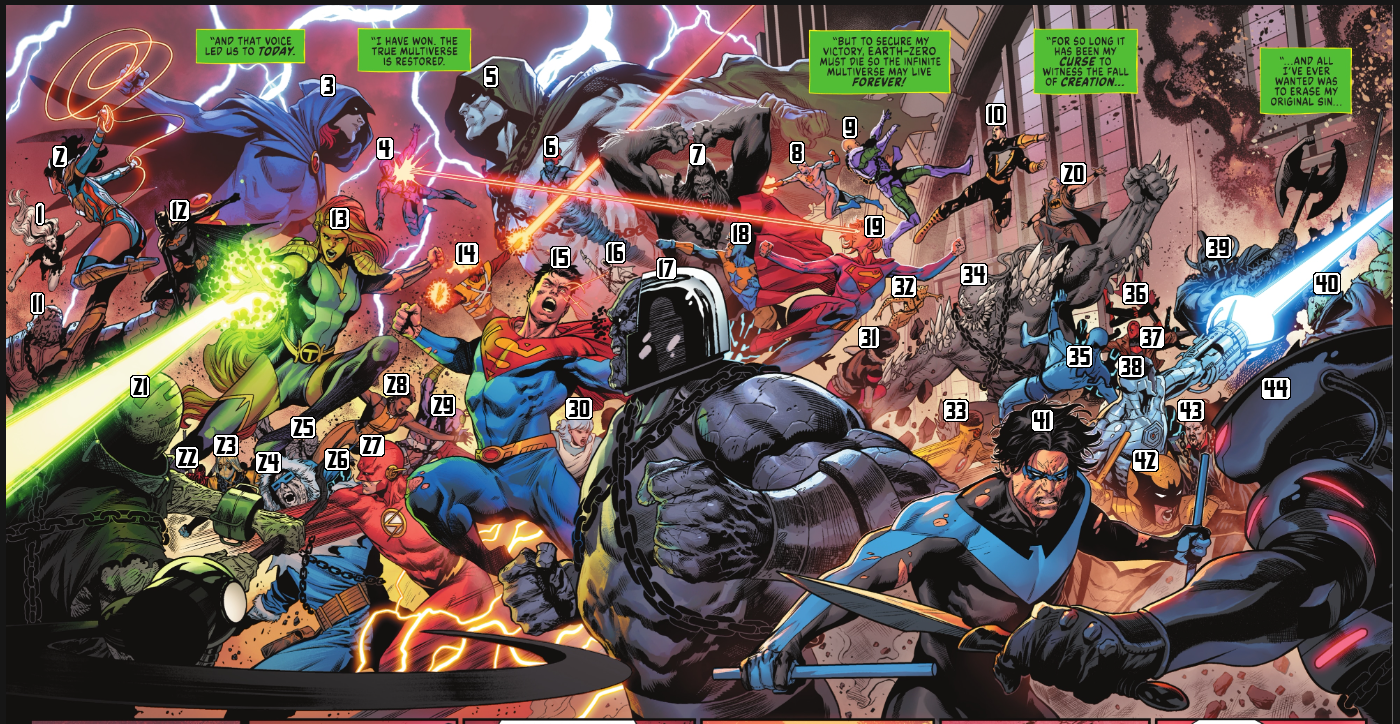 Pages 6 and 7 – Panel 1: The battle outside the Hall of Justice between the heroes and the Dark Army continues. Numbered image below (click for a larger version) with the key beneath it.