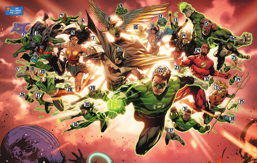 1) GL Gpaak (possibly) 2) GL Space Ape 3) Martian Manhunter 4) GL Salaak 5) Wonder Woman 6) GL Isamot Kol 7) GL Olapet (possibly) 8) Hawkgirl 9) GL unknown 10) GL Amanita 11) Zatanna 12) GL Chaselon 13) GL Simon Baz 14) Black Canary 15) GL Kilowog 16) GL Kyle Rayner 17) GL Rot Lop Fan 18) GL Larvox 19) GL Two-Six 20) GL Guy Gardner 21) Batman 22) GL Hal Jordan 23) GL Penelops 24) Flash 25) GL Arisia 26) GL unknown 27) GL Medphyll 28) GL Lok Neboora 29) GL Jo Mullein 30) GL Jessica Cruz 31) GL John Stewart 32) GL Apros 33) Aquaman 34) GL Charqwep 35) GL unknown 36) GL Green Man 37) GL Hannu 38) GL unknown
