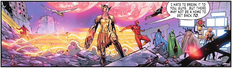 Page 14 – Panel 7: As five heroes die, five new worlds appear in the multiverse.