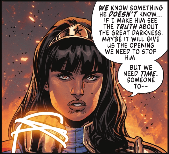 Page 15 – Panel 7: Wonder Girl can use her lasso of truth to make Pariah understand it’s not the Great Darkness he’s been talking to all this time.